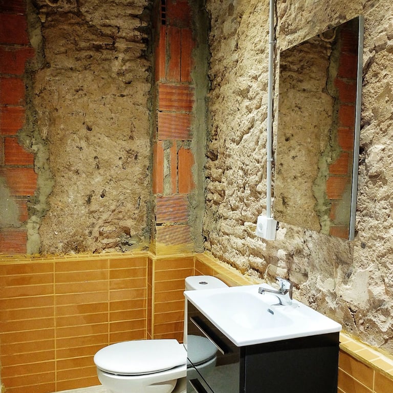 Un baño, una cocina, sillas, mesas y cómoda, lámparas (hay que usarlas cuando la luz se va), estantería, alargadores y 16 enchufes, altavoces, proyector. La pared es compleja para colgar elementos pero ya hay huecos en ella e intervenciones para poder colgar.